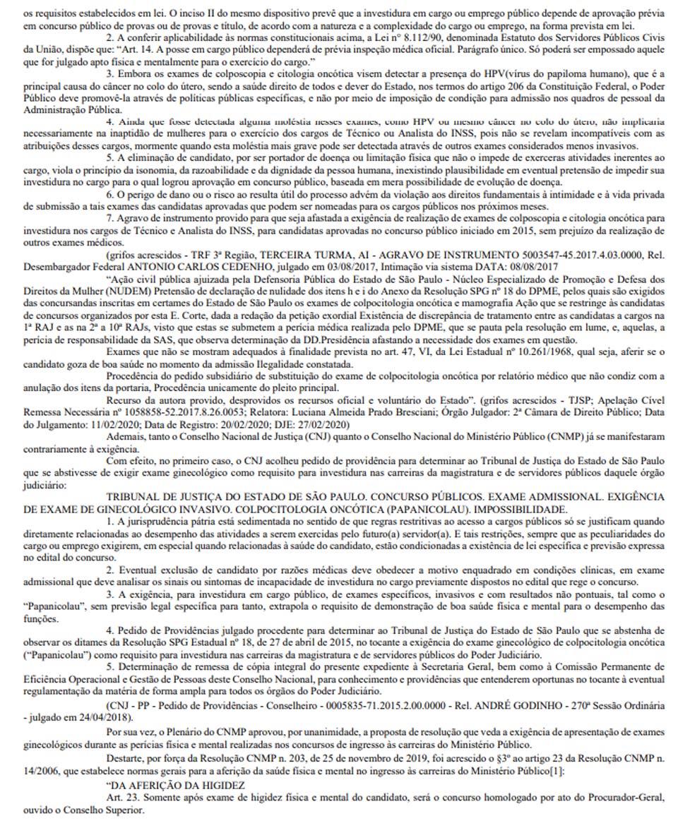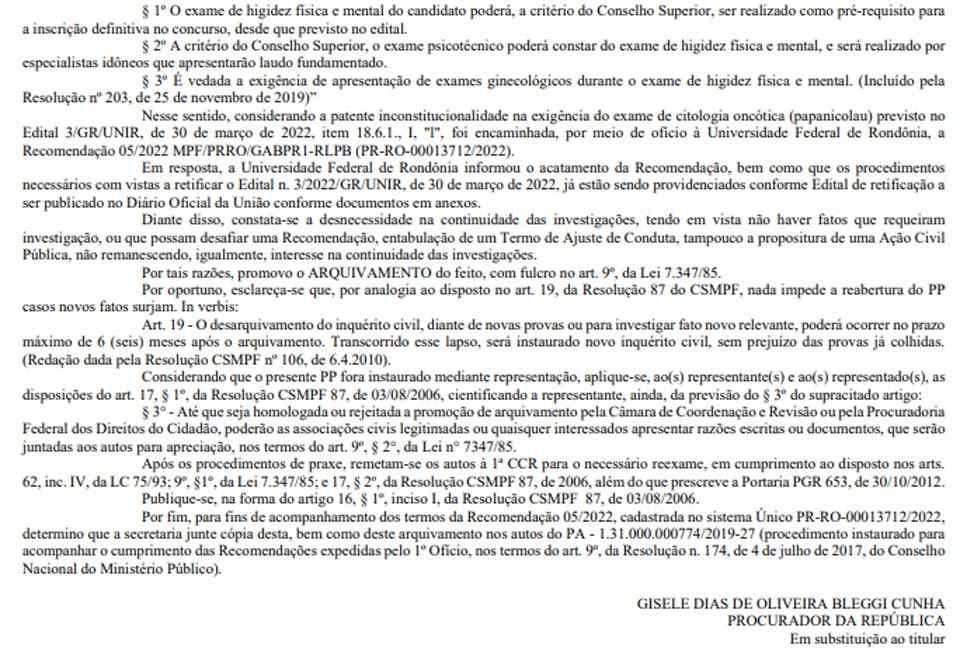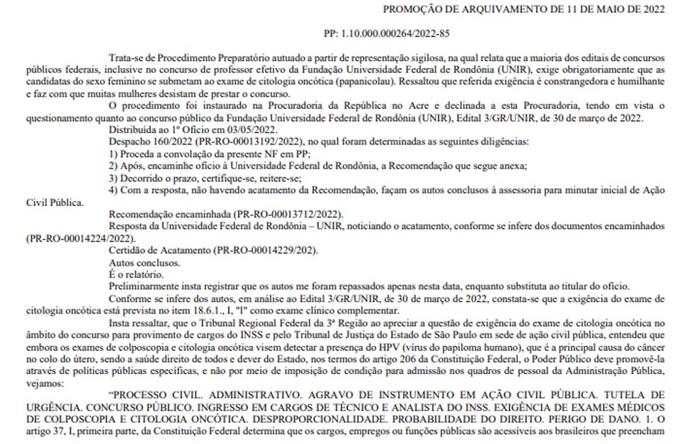 A representante do MPF/RO destacou que considerando a patente inconstitucionalidade na exigência do exame de citologia oncótica (papanicolau) prevista no “Edital 3/GR/UNIR [...] foi encaminhada, por meio de ofício à Universidade Federal de Rondônia, a Recomendação 05/2022 MPF/PRRO/GABPR1-RLPB (PR-RO-00013712/2022)”.