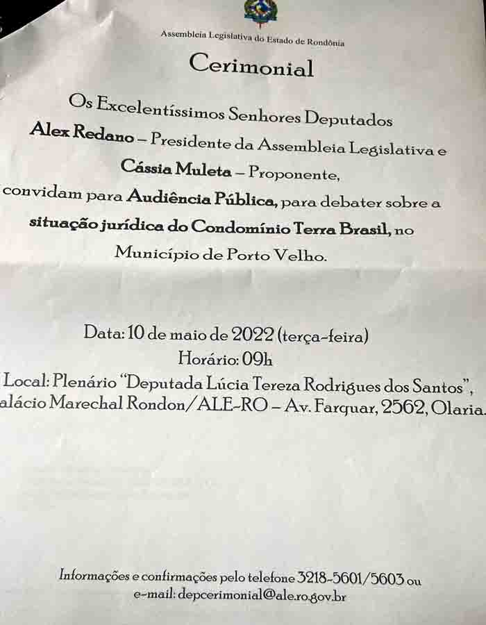 Porto Velho;RO – A deputada Cássia Muleta (Podemos-RO), propos nesta segunda-feira (9), em reunião com uma comissão representativa, Audiência Pública na ALE-RO, para debater situação juridica do condominio Terra Brasil, residencial popular localizado no município de Porto Velho, a ser realizada no próximo dia 10 de maio, as 9 horas, no Plenário “Deputada Lúcia Tereza Rodrigues dos Santos”.