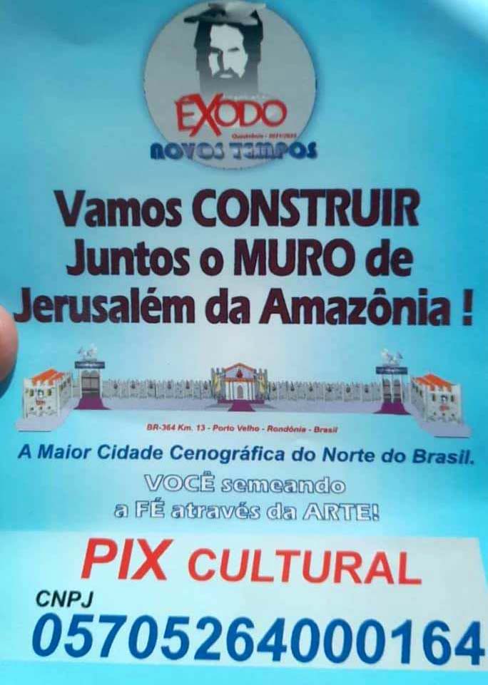 O Grupo Êxodo, responsável pela peça teatral “O Homem de Nazaré”, agora com nova diretoria, lançou esta semana o Projeto PIX Cultural, onde pretende arrecadar fundos para reconstruir o muro da cidade cenográfica Jerusalém da Amazônia, localizada a 21 quilômetros da cidade de Porto Velho (KM 13 da BR-364), próximo a Candeias do Jamari.