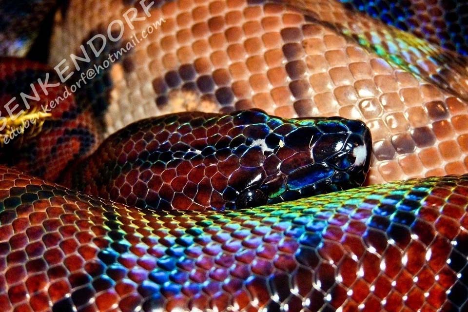 O efeito óptico é causado por componentes cristalinos (cristais de guanina) que se acumulam nas escamas da espécie e funcionam como prismas que decompõem a luz em diferentes cores, presentes também no arco-íris, que é gerado pelo mesmo fenômeno, porém, nas camadas de vapor d’água na atmosfera. Além das cores refletidas, essa serpente também é conhecida por ser uma espécie constritora, ou seja, que comprime as presas. Sua dentição, chamada de áglifa, não possui o dente inoculador de veneno. Deste modo, suas presas são abatidas por constrição, ou seja, tirando o ar através do estrangulamento.