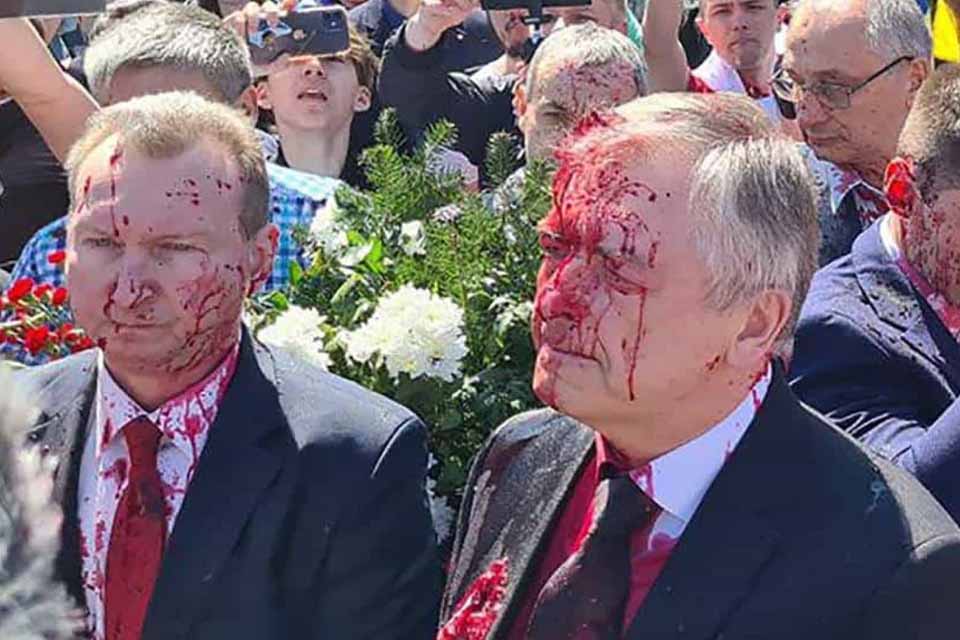 Manifestantes na Polônia jogaram tinta vermelha no embaixador russo no país, Sergei Andreev, nesta segunda-feira (9). O fato ocorreu quando ele participava de um ato em celebração ao Dia da Vitória.