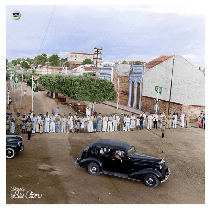 13 de outubro de1940 – Acaba a visita de “três horas”, que duraram mais de 48 horas, do presidente Getúlio Vargas a Porto Velho. Foram dias e noites de muitas atividades com desfiles, rodadas de conversas econômicas e políticas, homenagens, visita aos colégios (Barão do Solimões, Dom Bosco e Auxiliadora – prédio no alto da foto à direita), reuniões com lideranças, inspeção do quartel da guarnição federal, e de obras como o embrião da BR-364, cafezinho num sítio onde foi “apresentado” a um ouriço de castanha. Ainda teve a inauguração do motor de luz, a única atividade para as “três horas” do dia 11. Na foto, o carro do presidente, faz a curva na descida da então “Avenida Divisória” e toma a Sete de Setembro rumo ao porto da Madeira-Mamoré onde muitas outras pessoas o esperavam para a despedida. (F. Acervo e colorização Luís Claro).