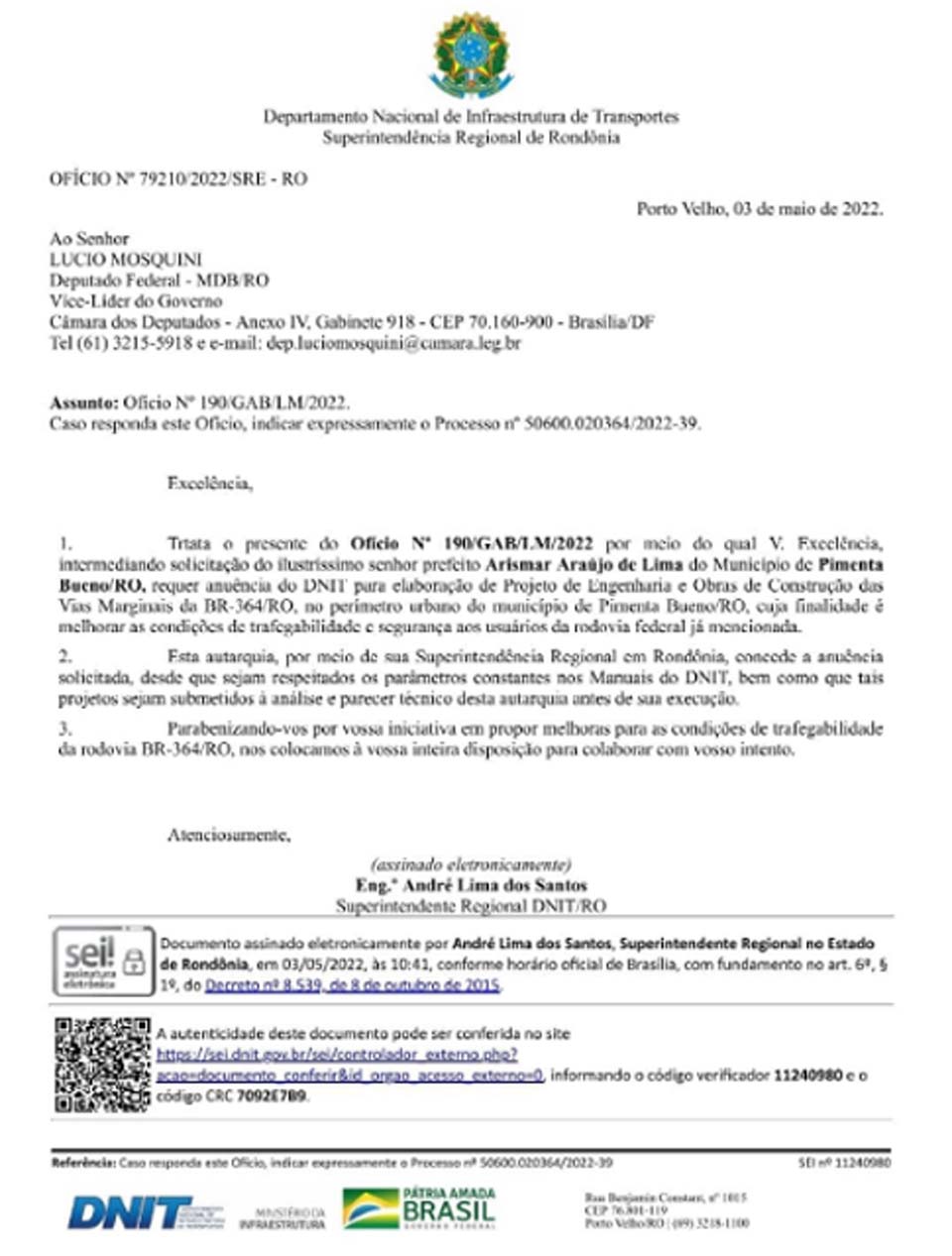 Recebemos autorização do DNIT para o início dos projetos das vias marginais da BR364 em Pimenta Bueno.