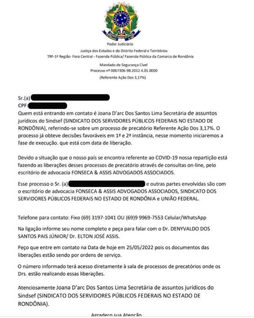 Reiteramos que o Sindsef/RO e sua assessoria jurídica que é realizada pelo Escritório Fonseca & Assis Advogados Associados, não fazem qualquer solicitação de depósito de valores.