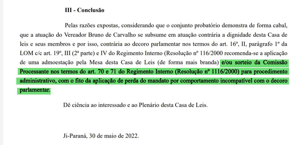 Na visão de seus “colegas”, a busca pelo órgão de fiscalização e controle “atentou contra a dignidade” da Câmara e o relatório aberto em procedimento disciplinar opinou pela admoestação do edil ou, de maneira mais drástica, indicando a instauração de uma Comissão Processante a fim de que seu mandato seja cassado.
