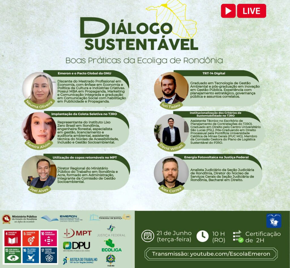 A live apresentará seis projetos de boas práticas. São eles: “Implantação da Coleta Seletiva no TJ-RO”, que será ministrada por Samira Alvim de Siqueira; “Utilização de copos retornáveis no MPT”, por Joel Alves Martins Filho; “TRT-14 Digital”, por Iuri Tadeu Ribeiro de Carvalho; “Institucionalização dos Critérios de Sustentabilidade no TJ-RO”, com David Willian Barroso Silva; “Emeron e o Pacto Global da ONU”, por Neuma Oliveira Souto Dória; e, finalizando, “Energia Fotovoltaica na Justiça Federal”, com Alex Correa de Leles. (Com informações da Assessoria de Comunicação Institucional do TJ-RO)
