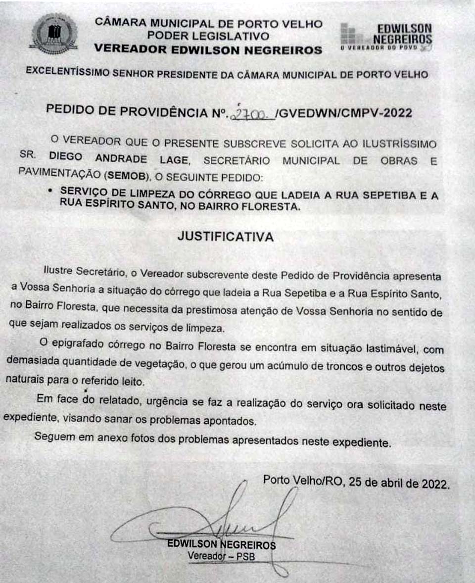 Negreiros informou a importância de se providenciar operação de limpeza de córrego próximo às ruas Sepetiba e Espírito Santo, Bairro Floresta, zona Sul da Capital.
