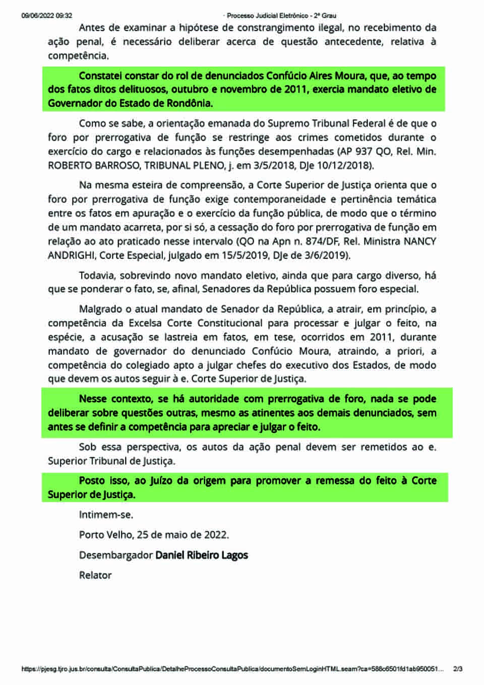 Sobre o pleito, o desembargador Daniel Ribeiro Lagos anotou que primeiro é necessário esclarecer de quem é a competência para julgar a ação penal já que Confúcio Moura era governador à época dos fatos e atualmente ocupa a função de senador da República, logo conservando foro por prerrogativa de função (foro privilegiado).