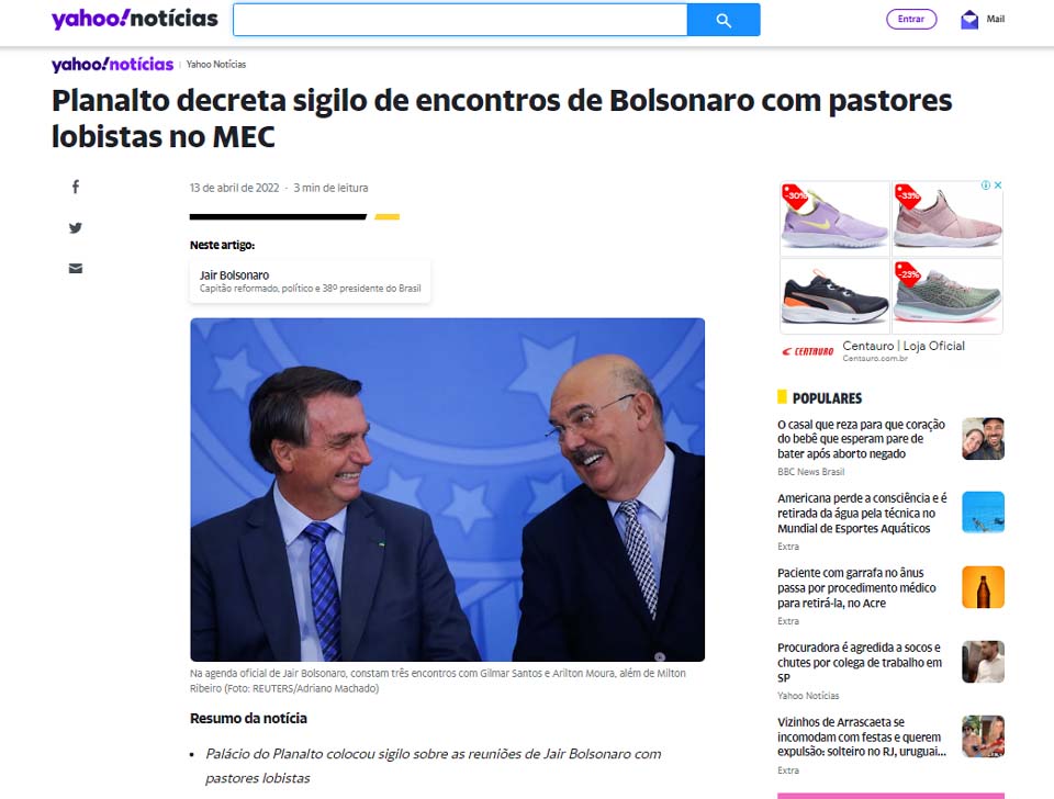 De acordo com o Yahoo Notícias, o “Planalto decretou sigilo de encontros de Bolsonaro com pastores lobistas no MEC”.