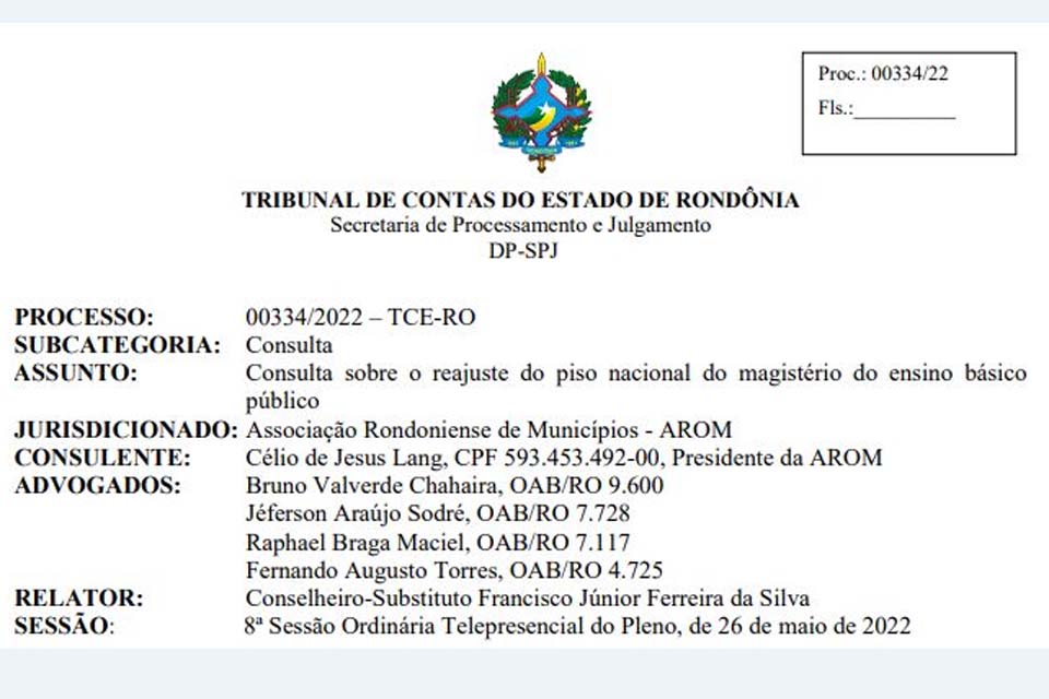 A AROM – Associação Rondoniense de Municípios encaminhou consulta ao Tribunal de Contas do Estado de Rondônia – TCE/RO, sobre o reajuste do piso nacional do magistério do ensino básico público em 2022.