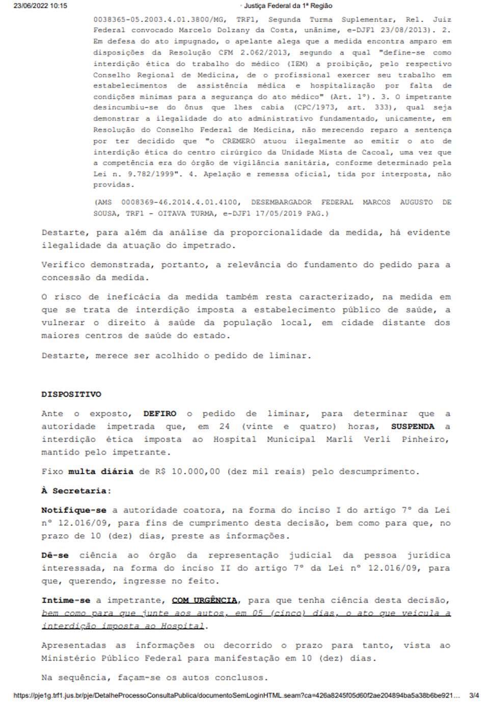 Em caso de descumprimento da liminar por parte do CREMERO a multa diária é de R$ 10 mil.