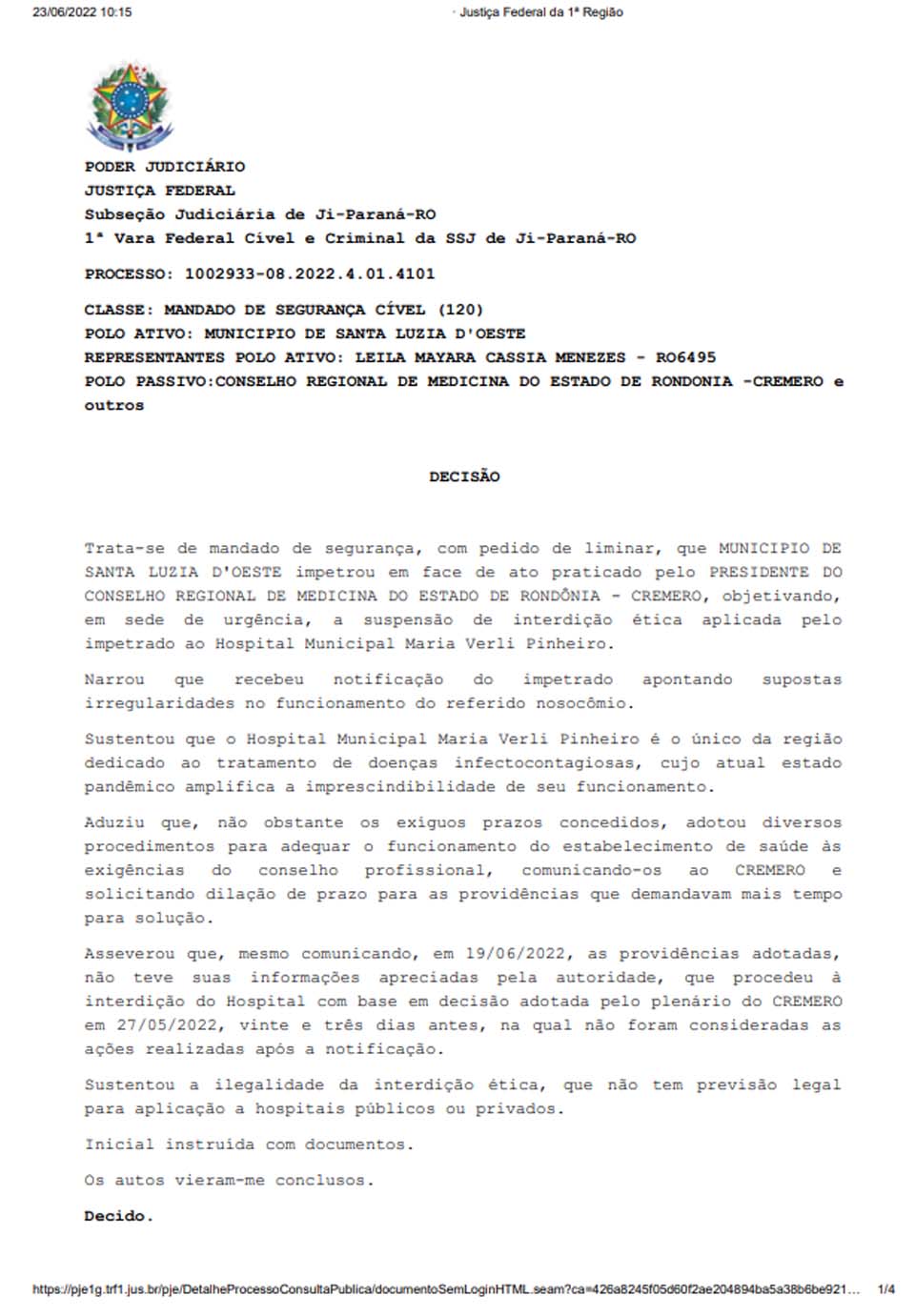 Porto Velho, RO – A Justiça Federal de Rondônia através de decisão proferida pelo juiz Samuel Parente Albuquerque determinou ao Conselho Regional de Medicina (CREMERO) que suspenda interdição ética realizada sobre hospital do interior.