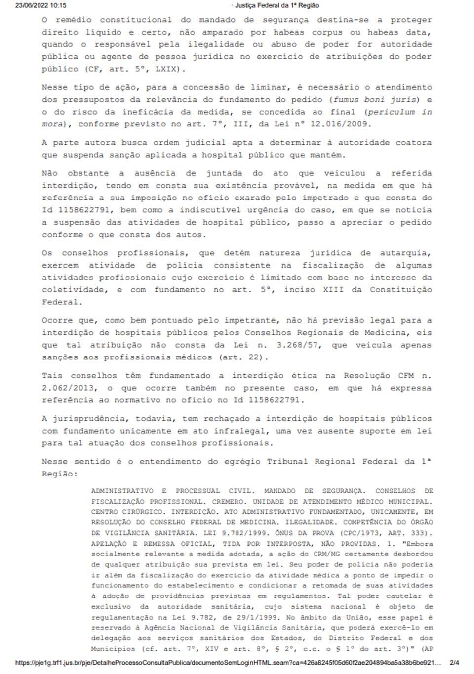 “Ocorre que, como bem pontuado pelo impetrante, não há previsão legal para a interdição de hospitais públicos pelos Conselhos Regionais de Medicina, eis que tal atribuição não consta da Lei n. 3.268/57, que veicula apenas sanções aos profissionais médicos”, anotou.