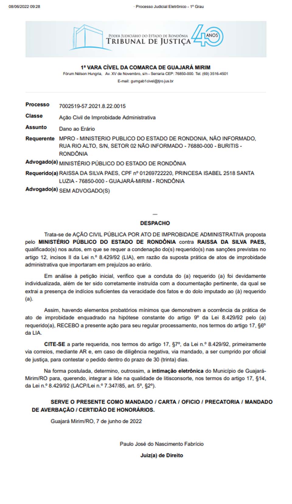 Porto Velho, RO – O juiz de Direito Paulo José do Nascimento Fabrício, da 1ª Vara Cível de Guajará-Mirim, recebeu ação civil pública de improbidade administrativa contra a prefeitra do município, Raíssa da Silva Paes, a Raíssa Bento, do MDB.