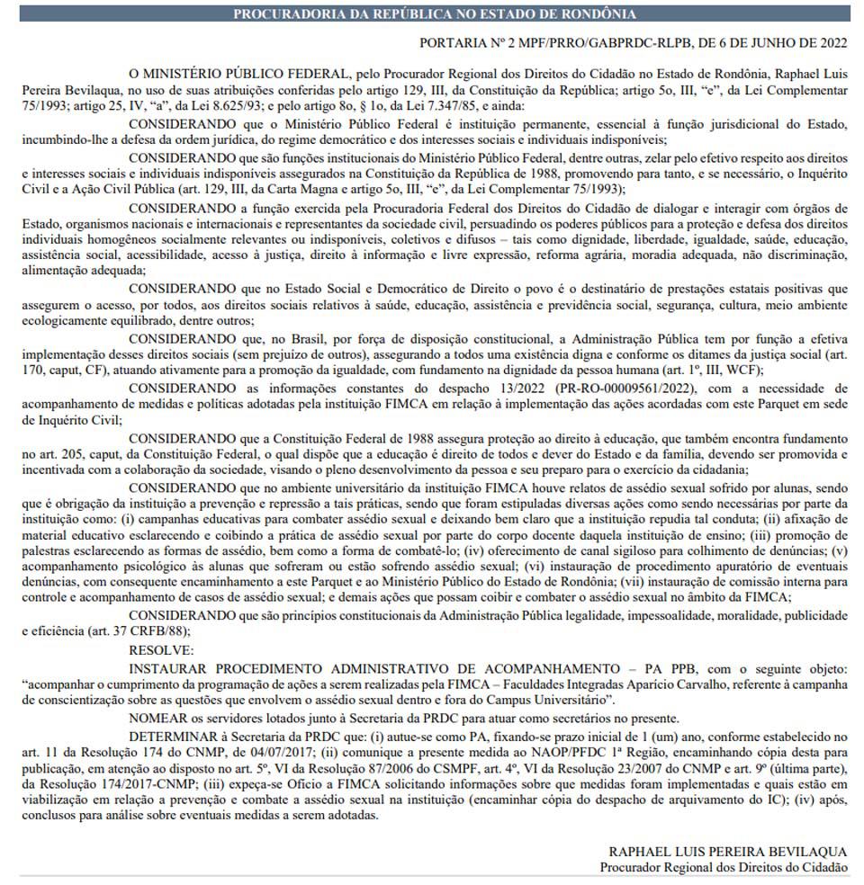 Porto Velho, RO – O Ministério Público Federal (MPF/RO) através de atuação do procurador da República Raphael Luis Pereira Bevilaqua instaurou processo administrativo de acompanhamento para fiscalizar ações da instituição de ensino Faculdades Integradas Aparício Carvalho (FIMCA).