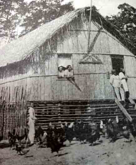 Implantada entre 1907 e 1912, a Linha Telegráfica que os índios chamavam de “Língua de Rondon” ligando Cuiabá a Porto Velho, instalou em vários espaços, dentro do território rondoniense, cerca de 12 estações telegráficas que serviam, além de suas finalidades, também para residência de telegrafista e guarda-fios. A da foto, a estação Urupá (depois Presidente Pena,Vila Rondônia e em 1977 Ji-Paraná) talvez pelo risco das águas inundarem o terreno, ou para guardarem animais domésticos como galinhas, era, como outras, assentada em palafitas. 75 anos depois de sua implantação, o núcleo formado pelo posto telegráfico de Jaru, como os de Vila Rondônia, Vilhena, Pimenta Bueno, Porto Velho e Ariquemes seriam atores importantes da criação do Estado.