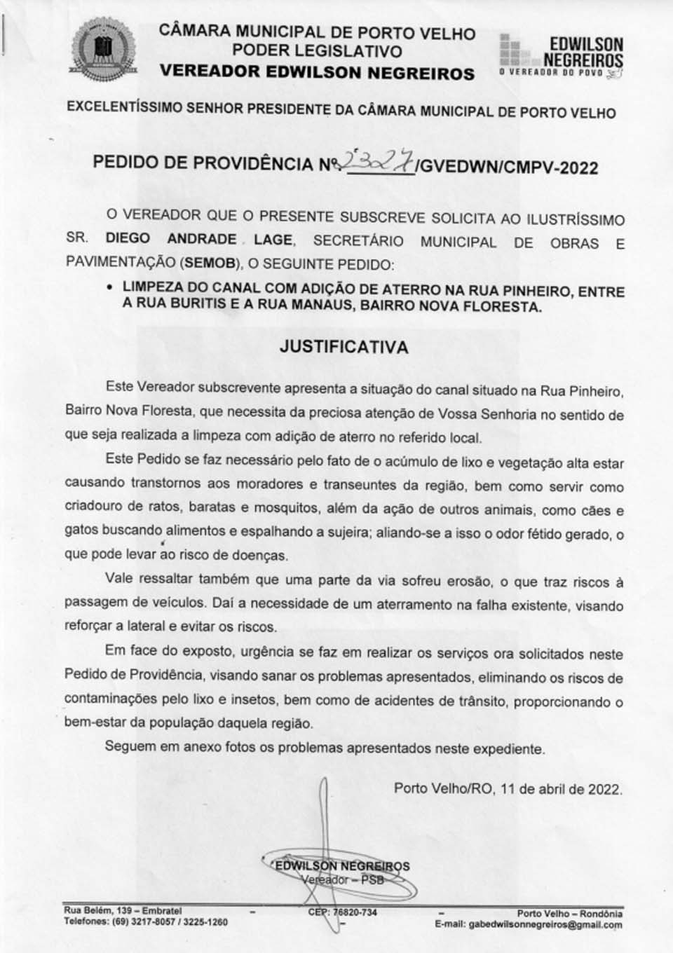 Porto Velho, RO – O vereador Edwilson Negreiros, do PSB, solicitou à Prefeitura de Porto Velho a limpeza de um canal situado à Rua Pinheiro entre as vias Buritis e Manaus, Bairro Nova Floresta, zona Sul da Capital.