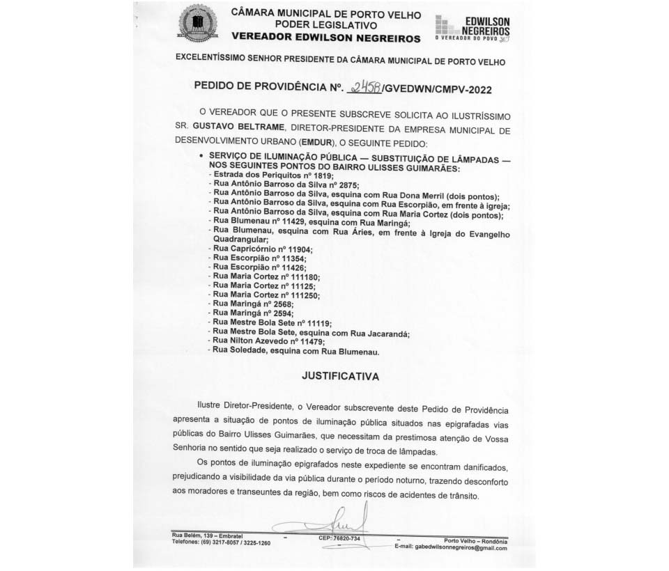 “A Prefeitura de Porto Velho começou a atender às necessidades apresentadas pela população através do nosso Gabinete na região do Ulisses Guimarães via EMDUR. A Câmara está sempre de portas abertas para ouvir a sociedade e repassar as demandas ao Executivo municipal. Lembrando que nosso papel também é fiscalizar a execução desses serviços até que estejam concluídos de maneira satisfatória”, concluiu.