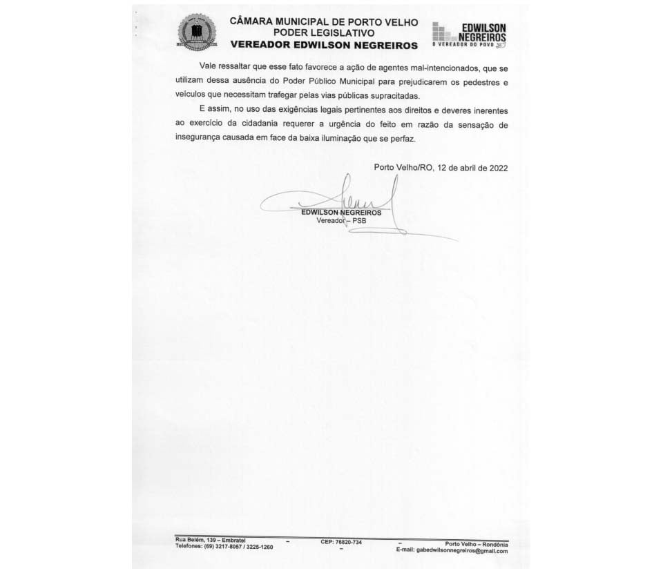 Porto Velho, RO – A Prefeitura de Porto Velho, gestão Hildon Chaves, do PSDB, atendeu mais um Pedido de Providência apresentado pelo vereador Edwilson Negreiros, do PSB, também presidente da Câmara Municipal.