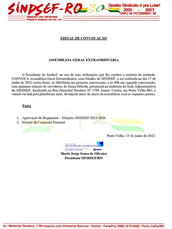 O Sindicato dos Servidores Públicos Federais no Estado de Rondônia – Sindsef/RO convoca todos os filiados para participarem de Assembleia Geral nesta sexta-feira, dia 17 de junho, às 8h30mim, conforme edital abaixo, para deliberações estatutárias para Eleições do Sindsef – pleito 2023/2026. Na assembleia será votado o regimento interno e a escolha dos membros para compor a Comissão Eleitoral.