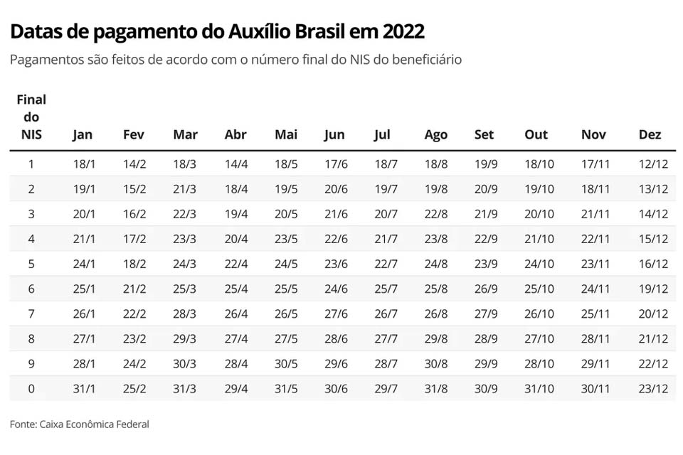 Começa nesta segunda-feira (18), o pagamento das parcelas de julho do Auxílio Brasil. A liberação das verbas é feita de acordo com a numeração final do Número de Identificação Social (NIS) do beneficiário, seguindo o calendário abaixo: