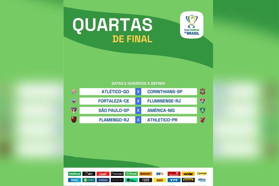 A CBF definiu por sorteio nesta terça-feira (19) os confrontos das quartas de final da Copa do Brasil e os mandos de campo. Os jogos de ida ficaram assim: Atlético-GO x Corinthians, Fortaleza x Fluminense, São Paulo x América-MG e Flamengo x Athletico-PR.