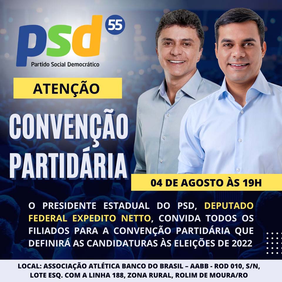 Presidente Estadual do PSD-RO, Netto convida a todos os filados para a convenção partidária, que ocorrerá no próximo dia 4, as 19 horas, na Associação Atlética Banco do Brasil-AABB, Rodovia 010, s/n, Lote esquina com a Linha 188, Zona Rural do município de Rolim de Moura.