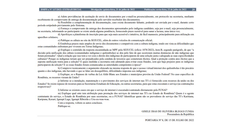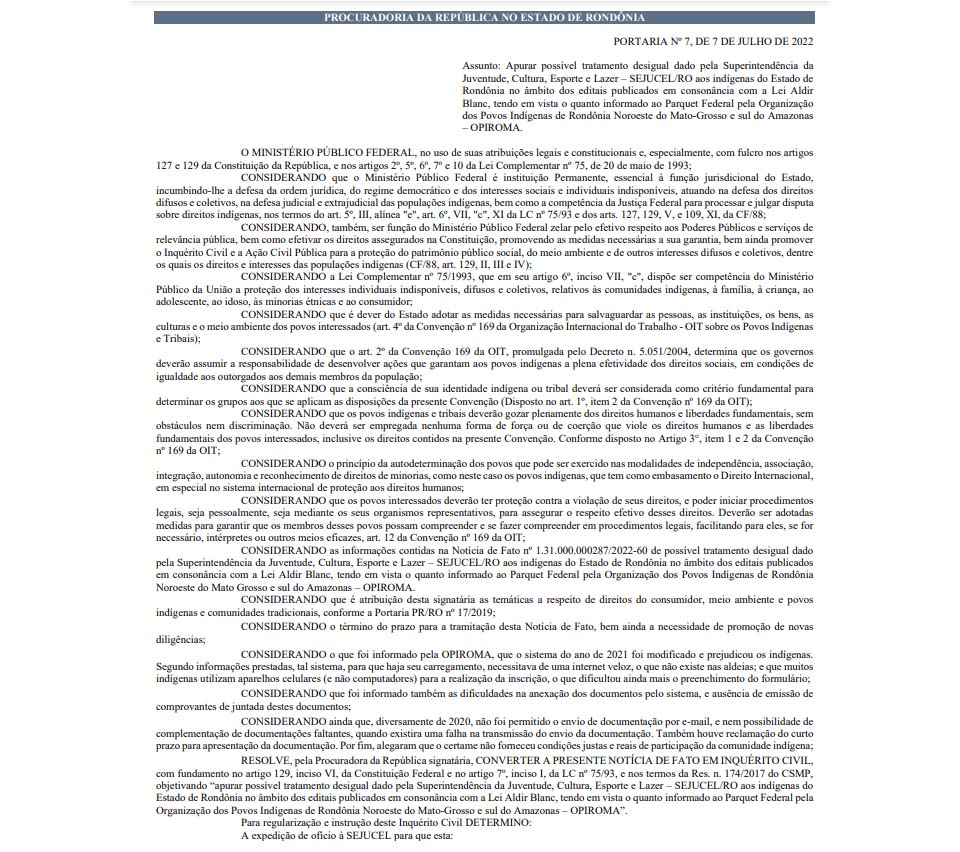 Isto, segundo Portaria publicada no Diário Oficial do órgão federal, “no âmbito dos editais publicados em consonância com a Lei Aldir Blanc, tendo em vista o quanto informado ao Parquet Federal pela Organização dos Povos Indígenas de Rondônia Noroeste do Mato-Grosso e sul do Amazonas (OPIROMA)”.