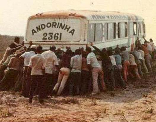 Quem viveu, viveu, e pode testemunhar, mas hoje há quem não acredite que, entre os anos 1960 e 1983, para se usar a BR-364 no espaço rondoniense, muitas vezes o jeito era sujar as botas e sapatos de lama, descer do ônibus e desatolar o ônibus, o caminhão ou qualquer tipo de transporte de quem viajava no trecho – normalmente os homens, como neste ônibus da Viação Andorinha, no caso foi na subida da serra entre Ouro Preto e Jaru. Só quem ficava dentro do veículo eram o motorista, as mulheres e crianças. Às vezes o desatolamento era feito debaixo de chuva, o que tornava a ladeira mais escorregadia e o risco maior de acidente.