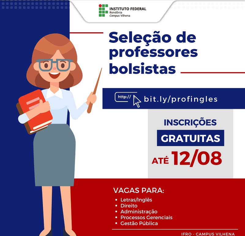 Com o objetivo de selecionar profissionais para atuarem como colaboradores bolsistas na oferta pelo Instituto Federal de Educação, Ciência e Tecnologia de Rondônia (IFRO), Campus Vilhena, do Curso de Formação Inicial "Inglês Básico", vinculado ao Projeto "Empoderamento da Mulher – 2022”, foi publicado o edital nº 31/2022, disponível em: https://selecao.ifro.edu.br/extensao-vilhena/987-edital-n-31-2022-selecao-de-colaboradores-para-curso-fic-em-ingles-basico-projeto-empoderamento-da-mulher.