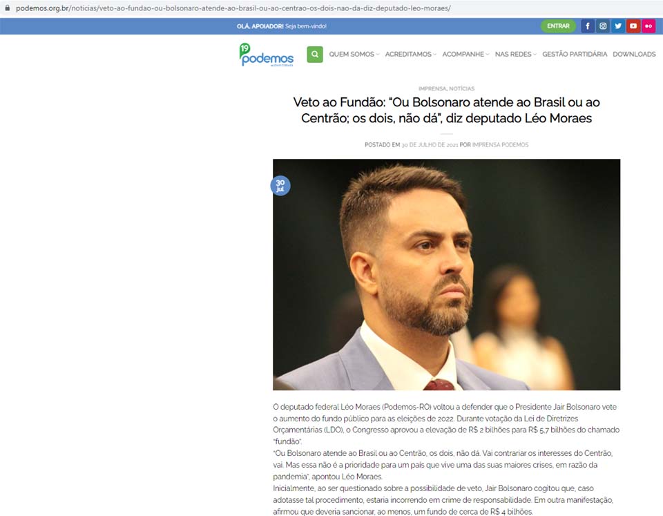 Porto Velho, RO – Em julho de 2021, no site oficial do Podemos, a legenda veiculou matéria intitulada “Veto ao Fundão: “Ou Bolsonaro atende ao Brasil ou ao Centrão; os dois, não dá”, diz deputado Léo Moraes”.