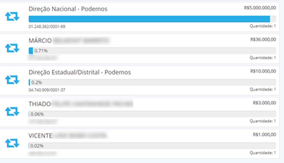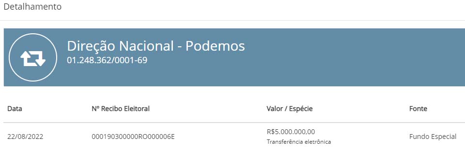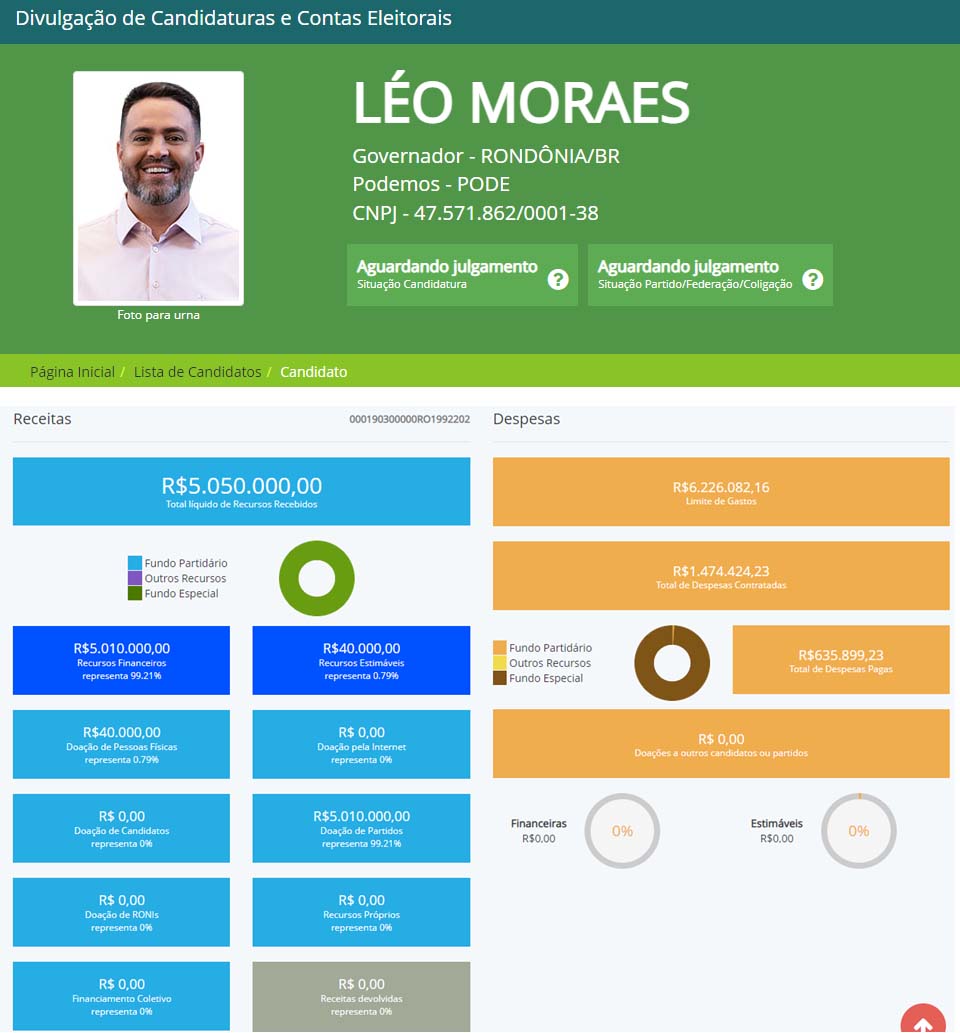 Na seção “Divulgação de Candidaturas e Contas Eleitorais”, página onde são expostos os dados financeiros acerca da candidatura de Léo Moraes, a Justiça Eleitoral atualizou as primeiras informações indicando o recebimento de R$ 5.000.000,00 (cinco milhões de reais) em Fundo Especial/Fundão Eleitoral (verde).