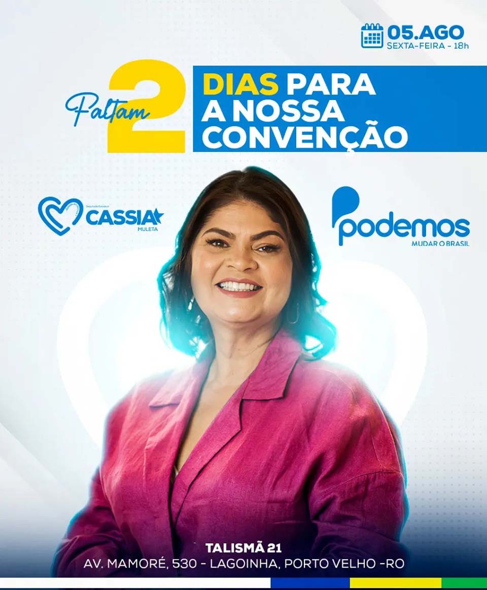 Porto Velho;RO - A Deputada Estadual Cássia Muleta (PODEMOS-RO), usou a rede social na última quarta-feira (3), para convidar o público em geral, simpatizantes, colaboradores e partidários, para a convenção do PODEMOS-RO, que se realizará na próxima sexta-feira (5), a partir das 17 horas, na Casa de Eventos Talismã, na Capital.