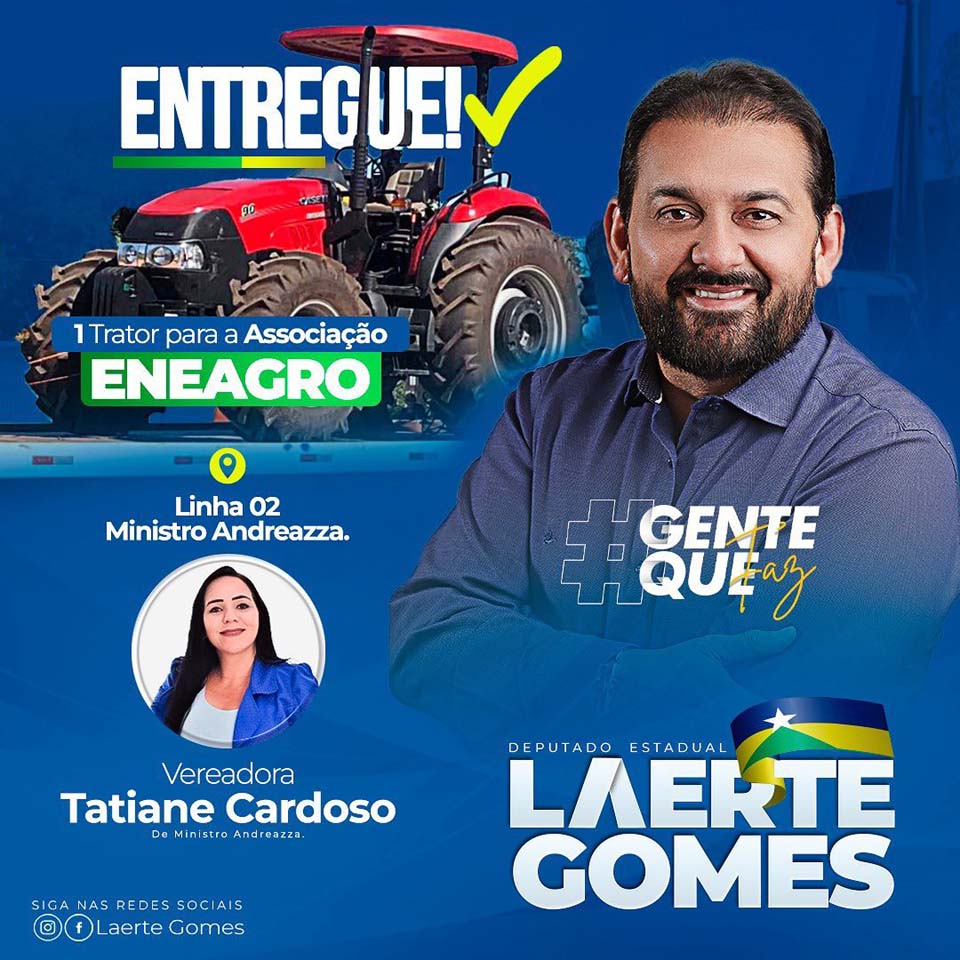 "PEDIDO FEITO, PEDIDO ATENDIDO! Foi entregue para o Município de Ministro Andreazza na associação ENEAGRO um trator para ajudar o desenvolvimento dos produtores rurais. Indicação da Vereadora Tatiane Cardoso", frisou Laerte.