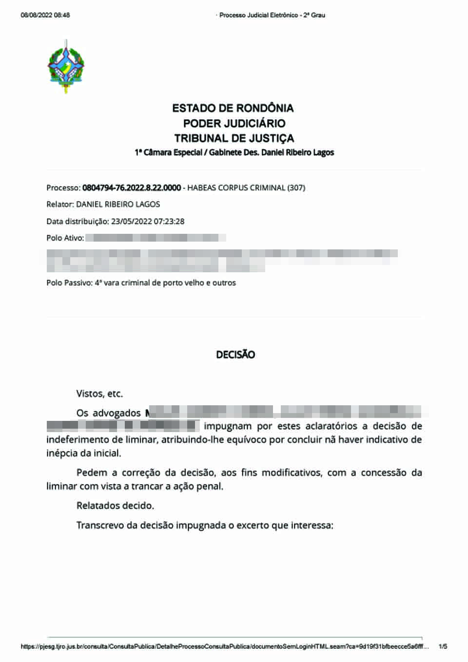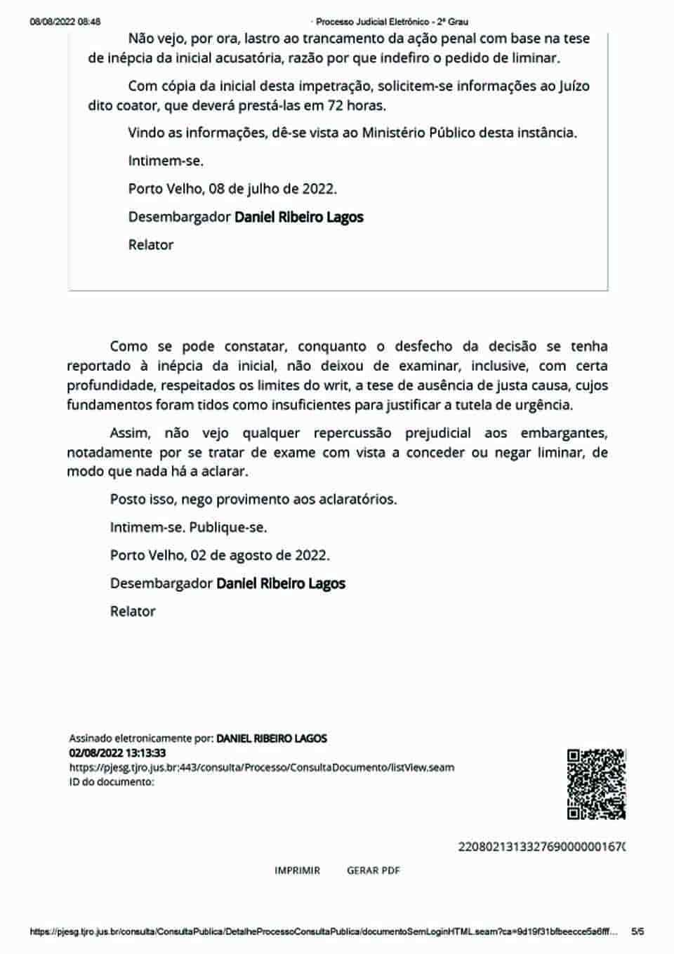 “Assim, não vejo qualquer repercussão prejudicial aos embargantes, notadamente por se tratar de exame com vista a conceder ou negar liminar, de modo que nada há a aclarar. Posto isso, nego provimento aos aclaratórios”, sacramentou o membro da 1ª Câmara Especial do Tribunal de Justiça (TJ/RO).