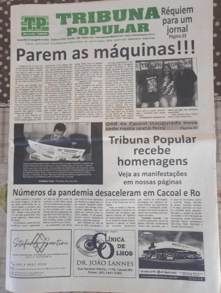 2021 – Última edição impressa do jornal “Tribuna Popular”, de Cacoal.