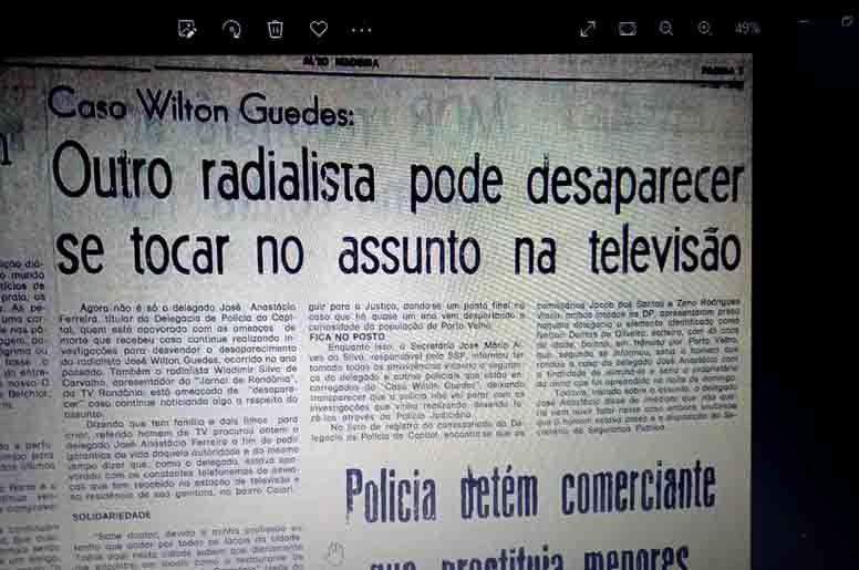 Um caso ainda não esclarecido totalmente pela polícia portovelhense, o sumiço do radialista José Wilton Guedes, como registrou o jornal Alto Madeira numa nota pequena dia 28 de agosto de 1976, mas quatro meses antes, em abril, o AM registrava que o delegado-geral José Anastácio dissera ao jornalista Wladimir de Carvalho que ele próprio, delegado, estava ameaçado de morte se desse andamento às investigações do crime o corrido em julho de 1975. Wladimir, âncora do telejornal da TV-Rondônia, pediu garantias à Polícia porque as ameaças já estavam atingindo sua família, mas de nada adiantou e o jornalista, conforme comentários da época, transferiu-se para Rio Branco (AC) e depois Brasília.