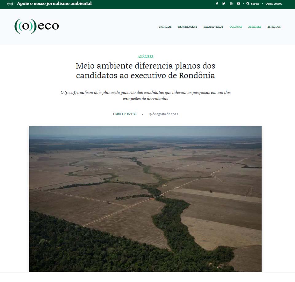 Porto Velho, RO – O site especializado em jornalismo ambiental, “OECO.org”, veiculou matéria intitulada “Meio ambiente diferencia planos dos candidatos ao executivo de Rondônia”.