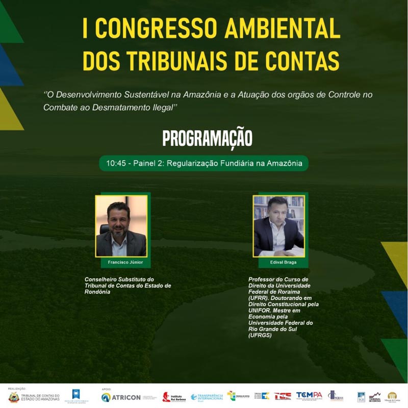 A participação do TCE-RO e do Profaz no I Congresso Ambiental dos Tribunais de Contas da Amazônia vai se efetuar por meio de palestra a ser ministrada pelo Conselheiro-Substituto Francisco Júnior Ferreira da Silva, no dia 15 de setembro, com a temática “Regularização Fundiária na Amazônia”.