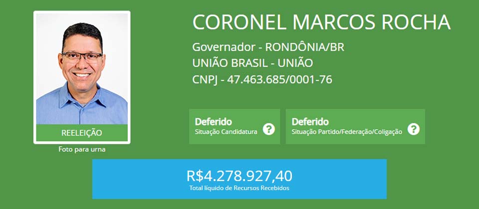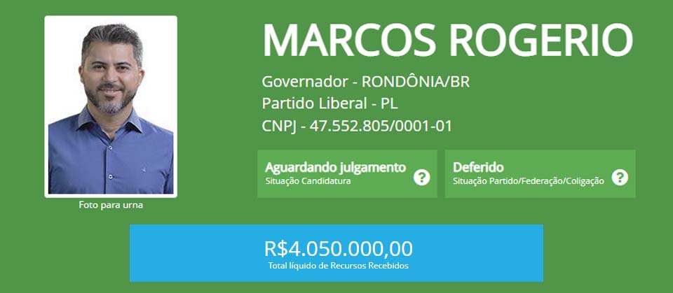O que mais recebeu dinheiro do Fundão foi Léo Moraes, do Podemos, com R$ 5 milhões; em seguida está o atual governador Marcos Rocha, do União Brasil, R$ 4,2 milhões; o congressista Marcos Rogério, do PL, ficou com R$ 4 milhões; e Pimenta de Rondônia, do PSOL, obteve pouco mais de R$ 280 mil.