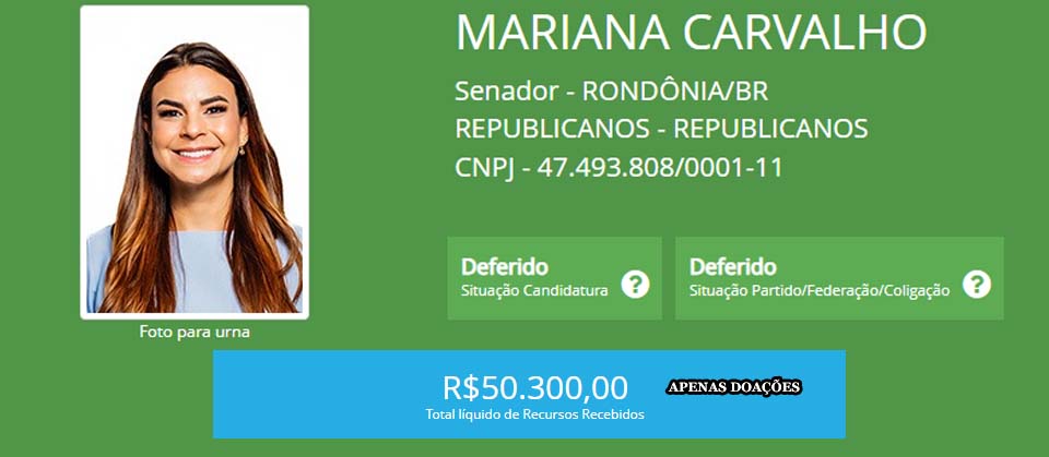 Mariana Carvalho, do União Brasil, e Jaime Bagattoli, do PL, só receberam doações de pessoas físicas. Não há registro, por ora, de captação de montantes oriundos do Fundo Especial.