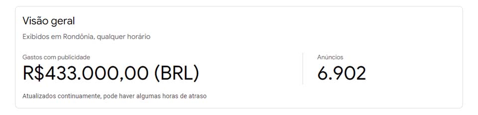 Porto Velho, RO – De acordo com uma ferramenta de transparência sobre publicações pagas veiculadas pelas plataformas Google, políticos de Rondônia já gastaram mais de R$ 430 mil com propagandas regionais.