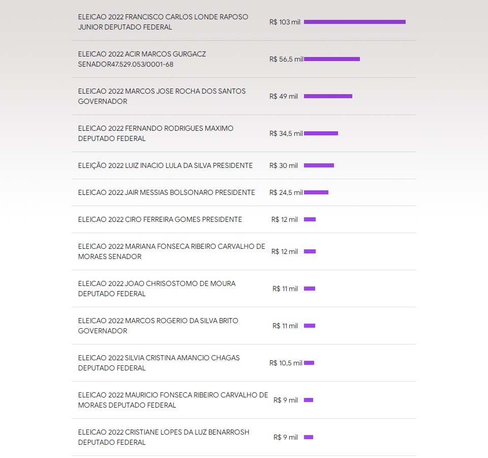 Entre eles, o que mais gastou foi Lula, do PT, com R$ 30 mil; Bolsonaro, do PL, vem em seguida, com R$ 24,5 mil e Ciro Gomes, do PDT, com R$ 12 mil. Este último empatado com a deputada Marian Carvalho, do Republicanos, candidata ao Senado.