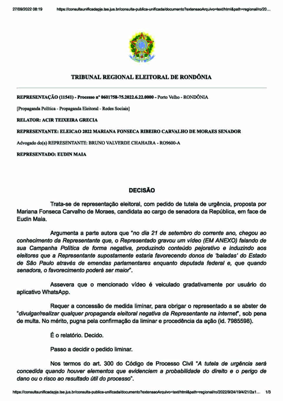 Foi assim que Acir Teixeira Grécia, juiz auxiliar da Propaganda Eleitoral do Tribunal Regional Eleitoral (TRE/RO) nas Eleições Gerais de 2022, rechaçou o pedido de censura prévia apresentado por Mariana Carvalho, do Republicanos, contra o humorista Eudin Maia.