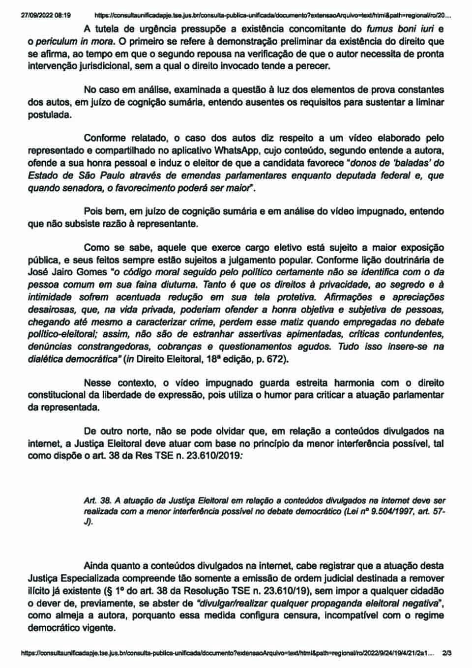 “Nesse contexto, o vídeo impugnado guarda estreita harmonia com o direito constitucional da liberdade de expressão, pois utiliza o humor para criticar a atuação parlamentar da representada”.