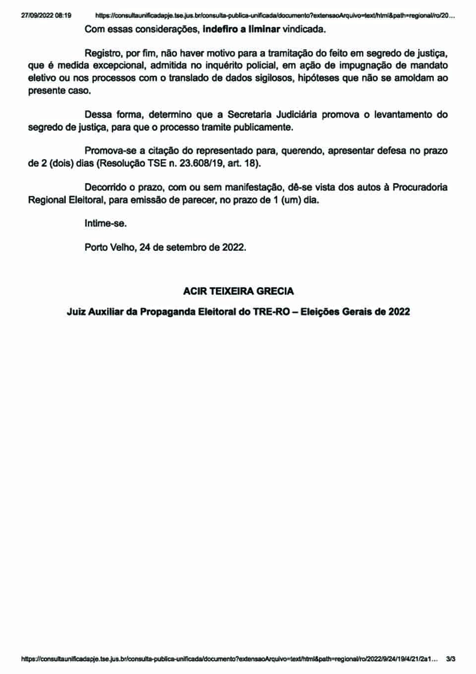 “Registro, por fim, não haver motivo para a tramitação do feito em segredo de justiça, que é medida excepcional, admitida no inquérito policial, em ação de impugnação de mandato eletivo ou nos processos com o translado de dados sigilosos, hipóteses que não se amoldam ao presente caso”, sacramentou o membro do TRE/RO.