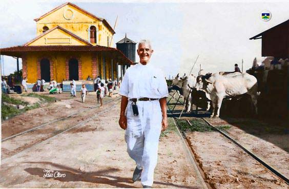 Em Guajará-Mirim (ao fundo a estação da ferrovia Madeira-Mamoré, agora Museu Municipal), o cidadão grego Carambalos Vassilakis, importante pioneiro e comerciante da “Pérola do Mamoré”, passeia entre as linhas do trem, tendo a sua esquerda, esperando clientes, carroças usadas para transporte de carga e puxadas por bois. Dois guajaramirenses, lembram: “Ele dava muita atenção a mim, apesar de eu ser bem criança”, disse Graciliano Maia, Filho, explicando: “Com problemas nas cordas vocais ele foi à Europa onde colocou um aparelho (pendurado em seu cinturão), que reproduzia o som de sua voz”. O escritor Paulo Saldanha escreveu: “Jamais esqueci a figura terna, polida, doce e firme do líder da família Vassilakis, o nosso Caralambos. Atencioso e educado, dava-me atenção apesar de minha tenra idade” - https://www.gentedeopiniao.com.br/colunista/paulo-saldanha/tributo-ao-empresario-caralambos-vassilakis (F. Roberto Lincoln Leite. Colored By: Luis Claro)