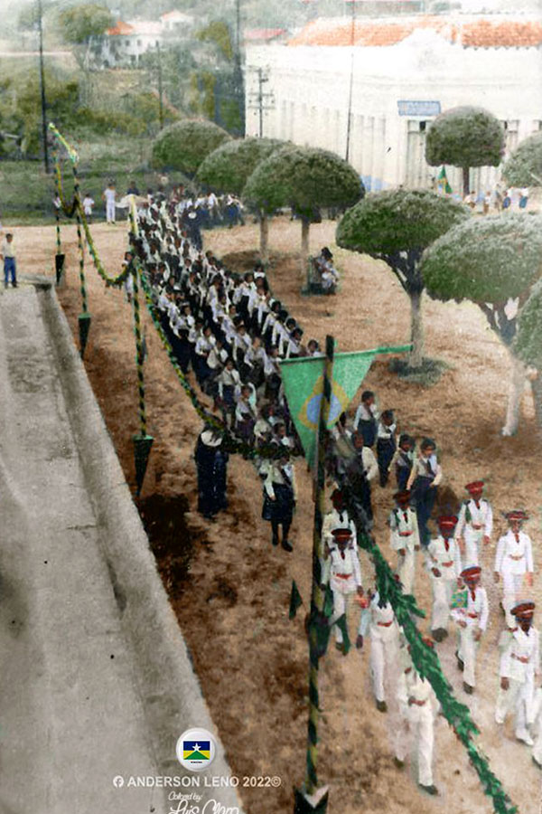 1938 – Em Porto Velho, que vivia em imensa crise gerada pela violenta e sucdessiva queda do preço da borracha, contingentes de alunos dos colégios Dom Bosco e Maria Auxiliadora participam do desfile em homenagem à passagem do 116º ano do Grito do Ypiranga, com os estudantes em seus trajes de gala. O cortejo reuniu ainda alunos do Grupo Escolar Barão de Solimões e outras escolas existentes, mas as festividades começaram bem cedo, com foguetes e missa solene celebrada pelo pároco João Nicolleti, no entorno do obelisco inaugurado no centenário da Independência, com participação de autoridades, à frente o prefeito Bohemundo Álvares Afonso e da população. (F. Acervo Anderson Leno colorizada por Luís Claro)