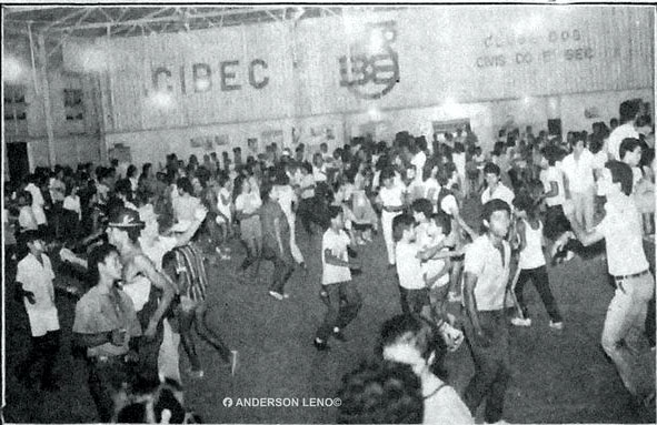Interior do Clube Cibec, galpão número 3 da ferrovia Madeira-Mamoré em Porto Velho, onde, nos finais de semana o salão era transformado em pista de dança, especialmente nos finais de tardes de domingo, local de muitos começos de namoros. “Muito frequentado e era grande point de Porto Velho na década de 1980”, relata o memorialista Anderson Leno, destacando o uso do espaço para ensaios de escolas de samba – na foto evolução dos passistas da Diplomatas do Samba. O galpão está em reforma, pela prefeitura, como todo o espaço da estação da Estrada de Ferro, sem previsão ainda de que a praça como um todo seja novamente colocada à disposição. (F. Anderson Leno – SaudosismoPortovelhense)