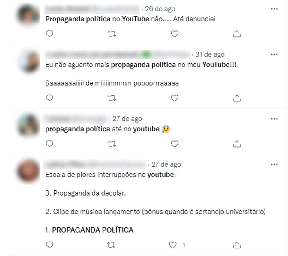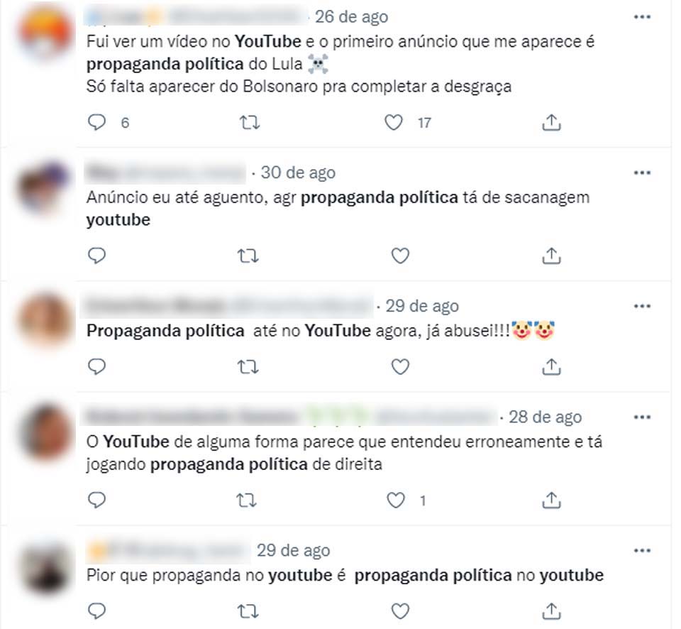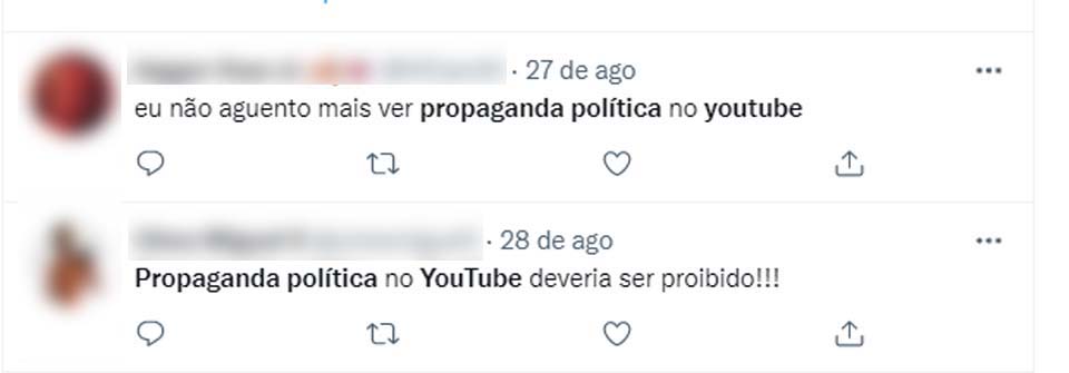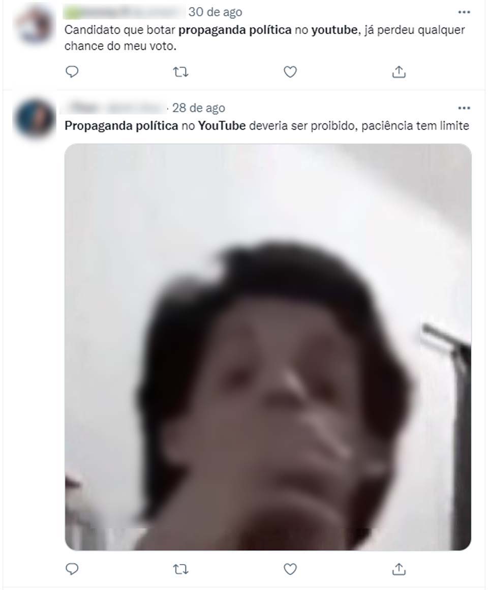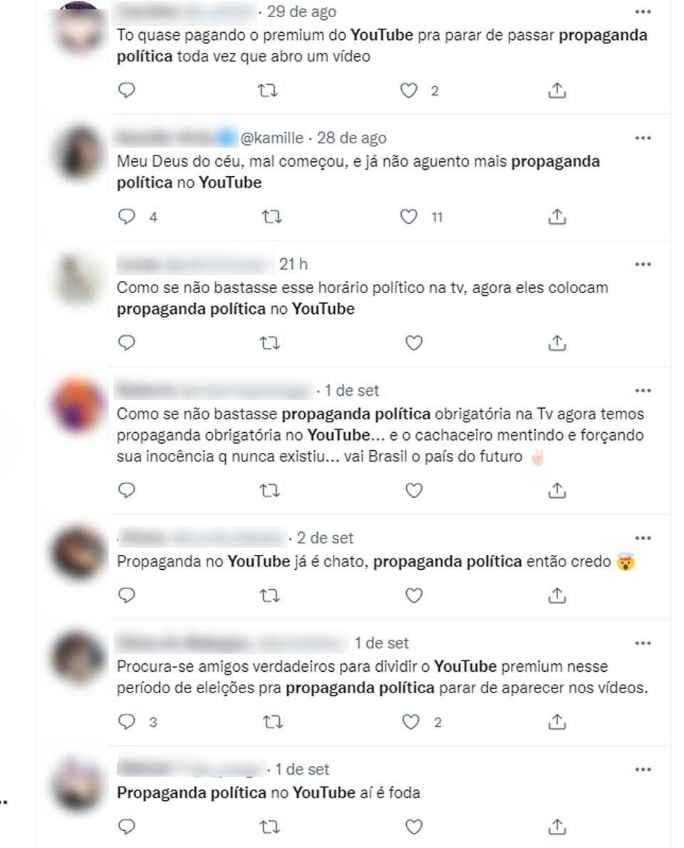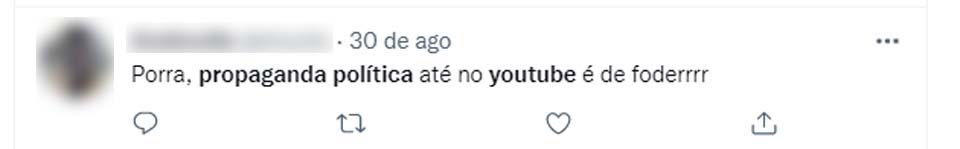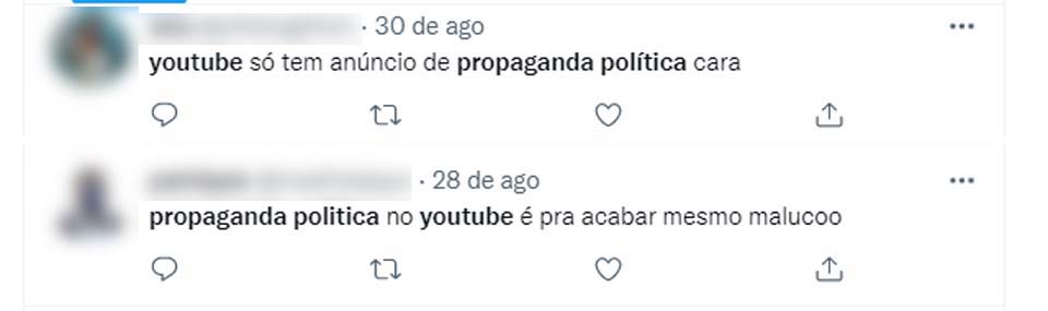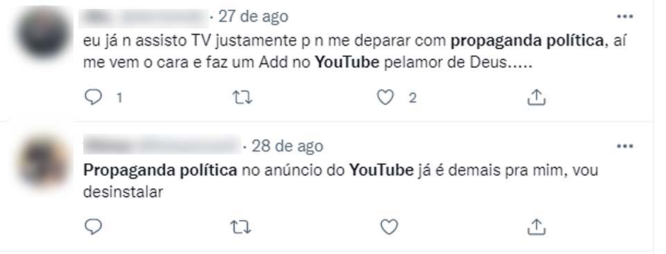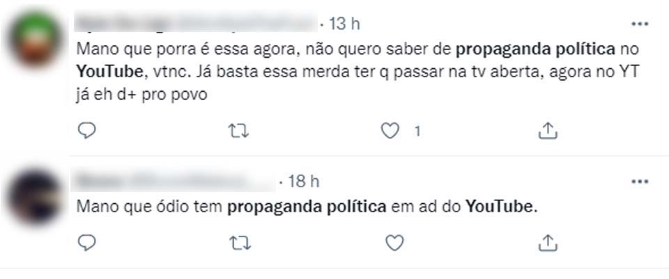 Ocorre que essa interrupção absurdamente desagradável causou revolta no Twitter, rede social em que pessoas costumam opinar a respeito do cotidiano. Na seção de busca, procurando pelos termos “propaganda política”, entre aspas, e YouTube, fora delas, a caixa de resultados traz infinidade de manifestos negativos.